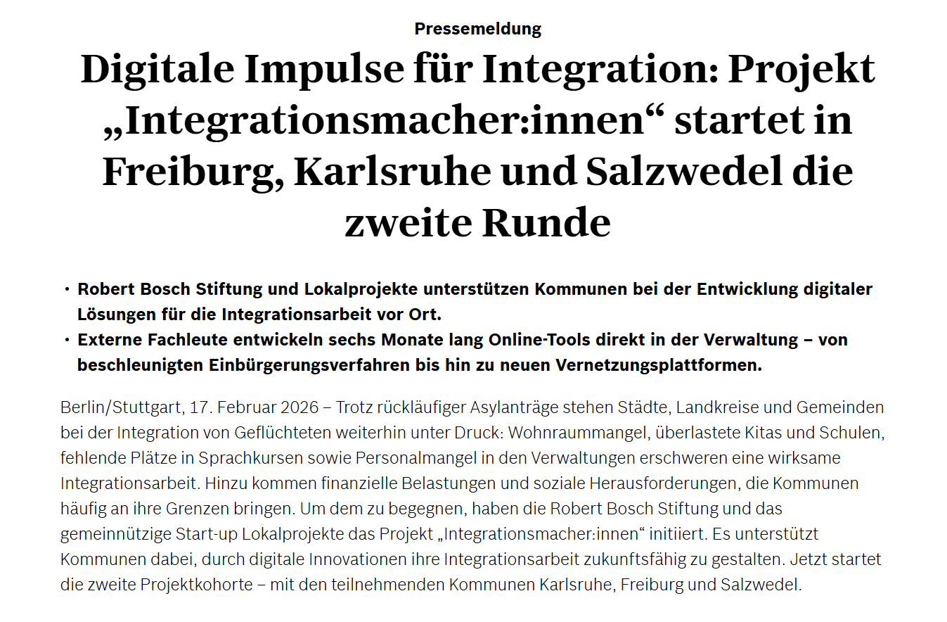 Lokalprojekte bringt engagierte Menschen aus Verwaltung und Gesellschaft zusammen, um langfristige Lösungen für lokale Herausforderungen zu schaffen. Gemeinsam setzen wir Projekte um, die Zukunft gestalten: von der digitalen Transformation, über lokalen Klimaschutz, bis hin zur Integrationsarbeit.